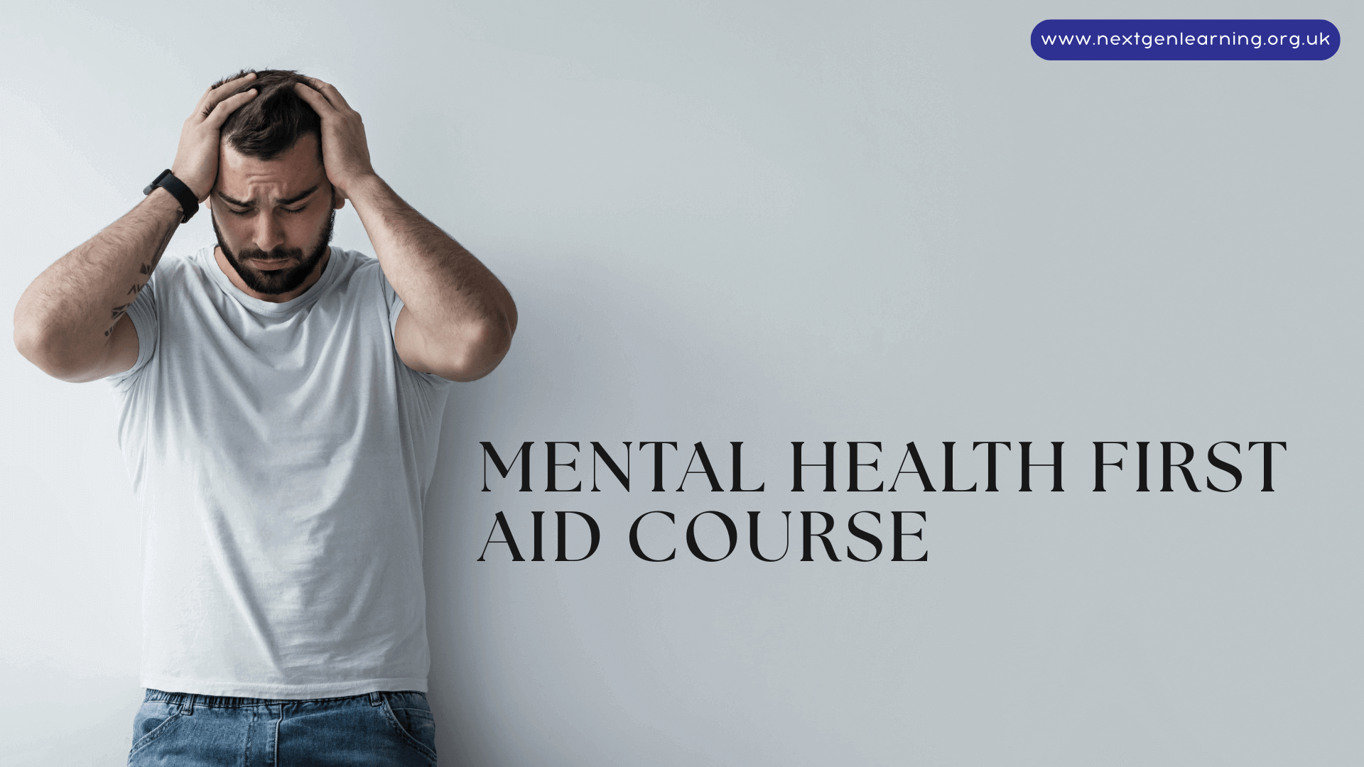 The image shows a man standing against a plain light grey background, appearing visibly distressed as he holds his head in both hands. To the right of the man, bold black text reads “Mental Health First Aid Course.” The composition conveys a strong message about mental health struggles and the importance of gaining the skills to offer support through proper training.